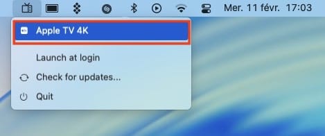 Lancez l’applicaiton. Vous devez l’apercevoir depuis la barre des menus du Mac. Cliquez sur le menu correspondant à votre Apple TV.