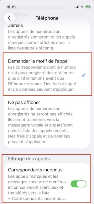 Tout d’abord sous Filtrage des appels cochez la case Correspondants inconnus ainsi « Les appels manqués et les messages vocaux de numéros inconnus seront silencieux et transférés vers la liste « Correspondants inconnus » ». Ensuite, vous avez trois possibilités :