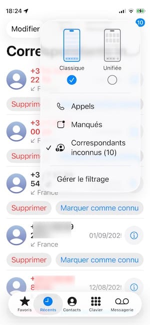 Lancez l’app Téléphone de votre iPhone puis touchez en haut à droite de l’écran les trois tirets. Sélectionnez le menu Correspondants inconnus. Dans notre exemple, il y en 10.