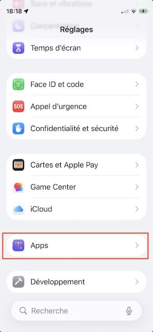 Depuis votre iPhone, allez sous Réglages et tout en bas de la liste développez le menu Apps.